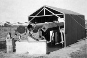 Búnaðurinn í Sobral, 29. maí 1919. Fremst eru tveir geislabeinar, vélknúnir speglar, sem beina stöðugt ljósi frá næsta umhverfi myrkvaðrar sólar til láréttu kíkjanna í kofanum. Viðfangsgler sívalningslaga sjónaukans er 13 þumlungar en aðeins 4 þumlungar í þeim kassalaga. Þegar til kom reyndist sá sjónauki mun betur.