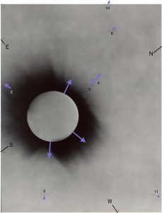 Ein af sólmyrkvamyndunum sem þeir Crommelin og Davidson tóku í Sobral. Bláu örvarnar, sem teiknaðar eru inn á myndina, sýna spá Einsteins um hlutfallslega hliðrun stjarna á hvelfingunni vegna ljóssveigjunnar. Til þess að örvarnar sjáist nógu vel eru þær hafðar 320 sinnum of langar miðað við stærð sólkringlunnar. Mynd: The Royal Observatory í Greenwich.