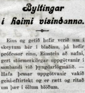 Mynd af Einstein á forsíðu þýska blaðsins Berliner Illustrirte Zeitung, 14. desember 1919. Undir myndinni stendur: Eine neue Grösse der Weltgeschichte: Albert Einstein, dessen Forschungen eine völlige Umwälzung unserer Naturbetrachtungen bedeuten und den Erkenntnissen eines Kopernikus, Kepler und Newton gleichwertig sind.
